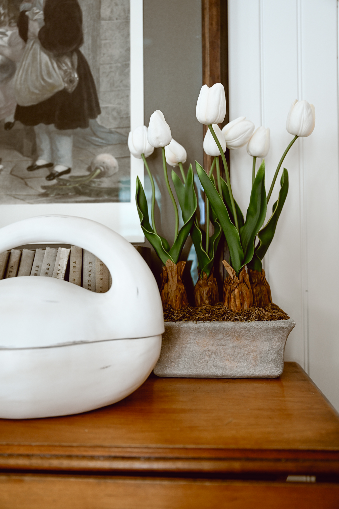 This woodchip basket is one of my favorite pieces for organizing and displaying. It has that rustic charm that works so beautifully in any space. Use it to store throws, pillows, or even flowers for a cozy, welcoming feel. It’s a perfect addition to your spring décor.
