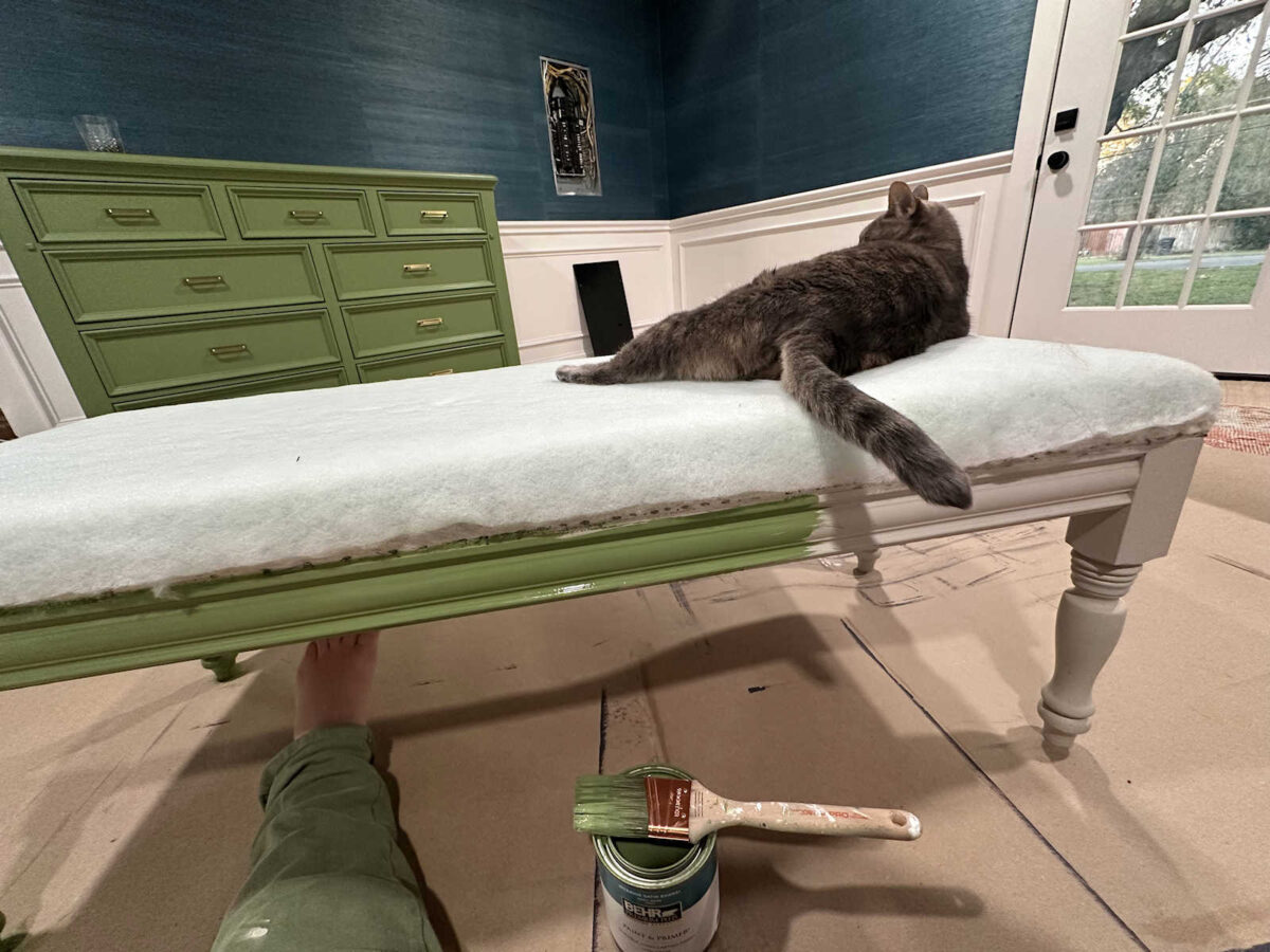 So with that decision made, I was ready to get started on this makeover. I started by giving the base two coats of the same green paint that I used on the dresser. And you can see my view the whole time I was painting.