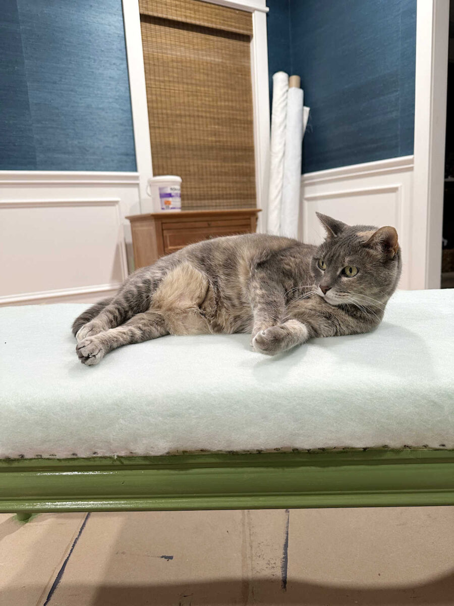 I realized a couple of days ago that I could get the bedroom suite foyer finished pretty quickly since there are no really big projects for this area, so that’s what I’ve decided to focus on before I start sewing draperies for the bedroom. So yesterday, I pulled out the bench for the foyer corner and reupholstered it.