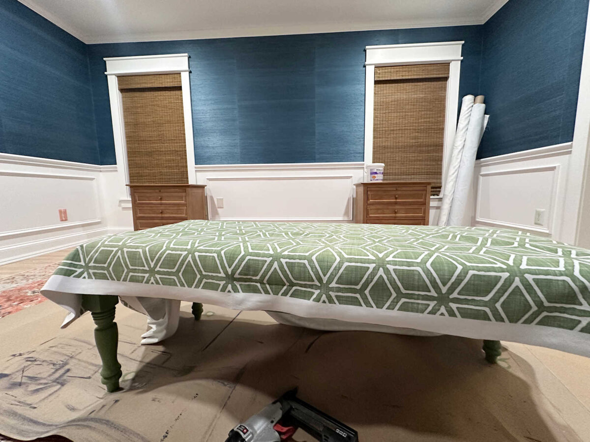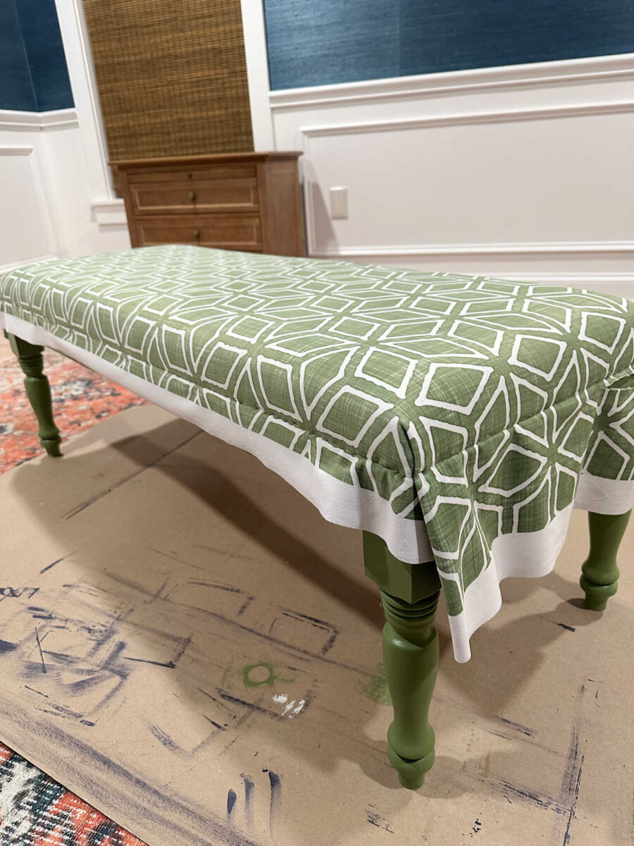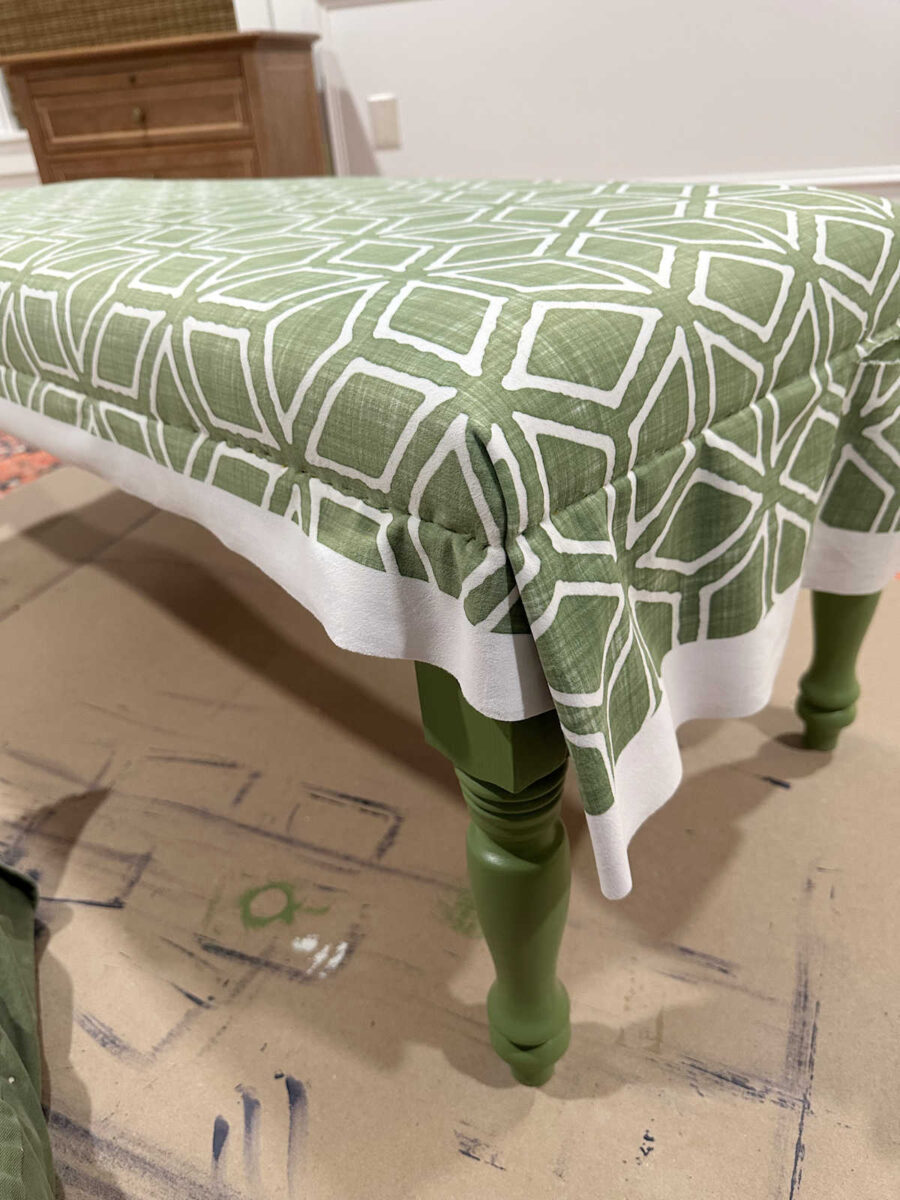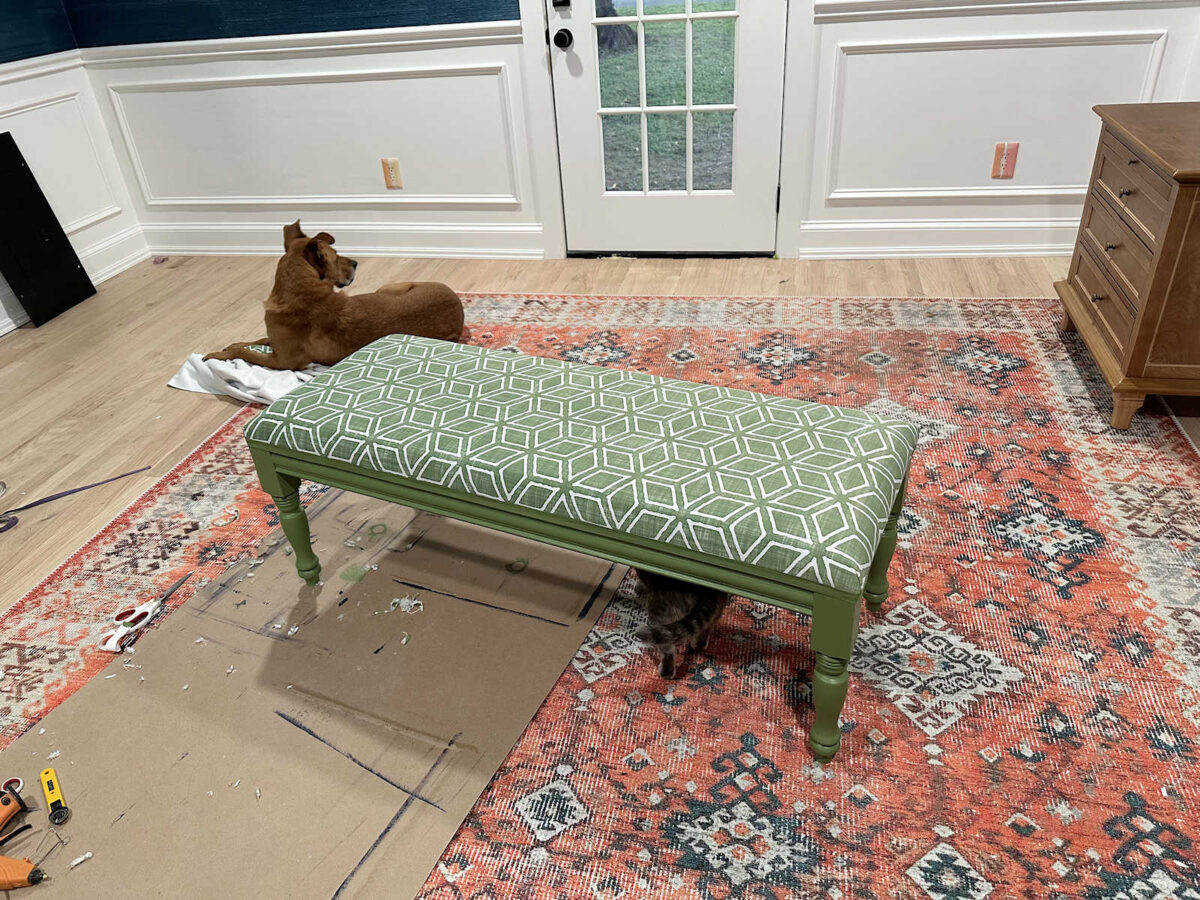After the paint had time to dry, I started on the upholstering. This was a quick and easy project. It’s pretty much a wrap-and-staple upholstering process except that the fabric doesn’t wrap underneath the padded top. Instead, I stapled it along the sides (because the plywood is glued to the base), and then I covered over the staples with green trim.