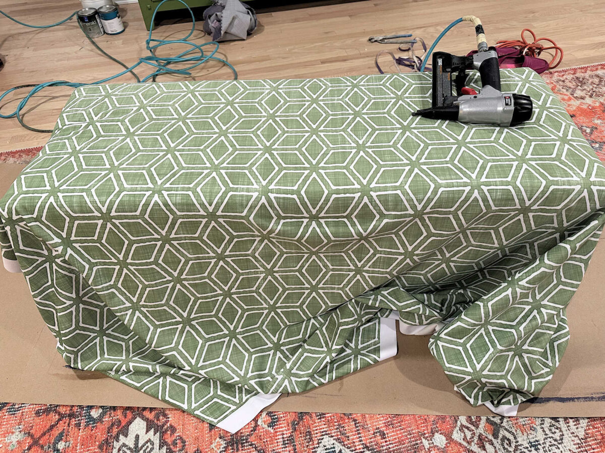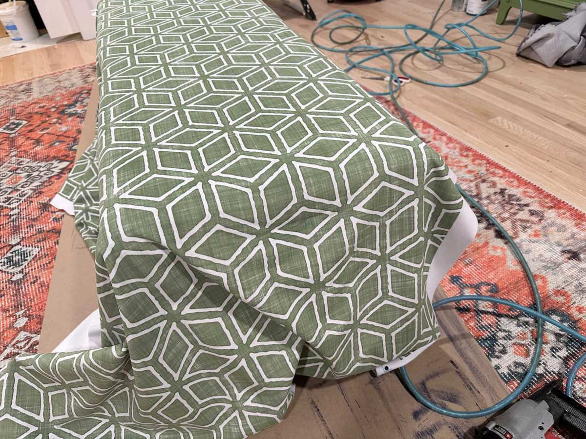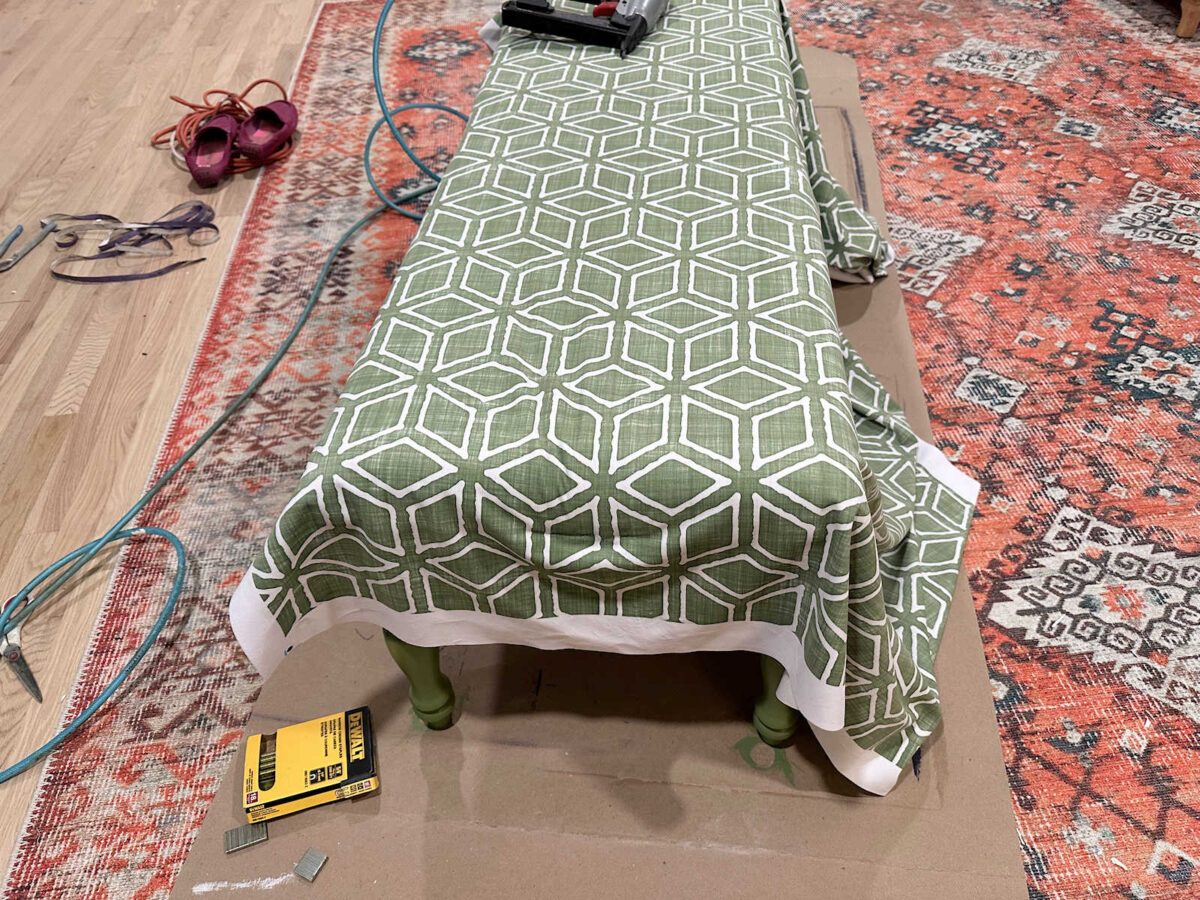 And then I went back and stapled the rest, working out from the center to the corners on each side of the bench. On the corners, I folded the extra fabric from the long sides over to the end, and then folded the fabric on the end on top of that and stapled it into place.
