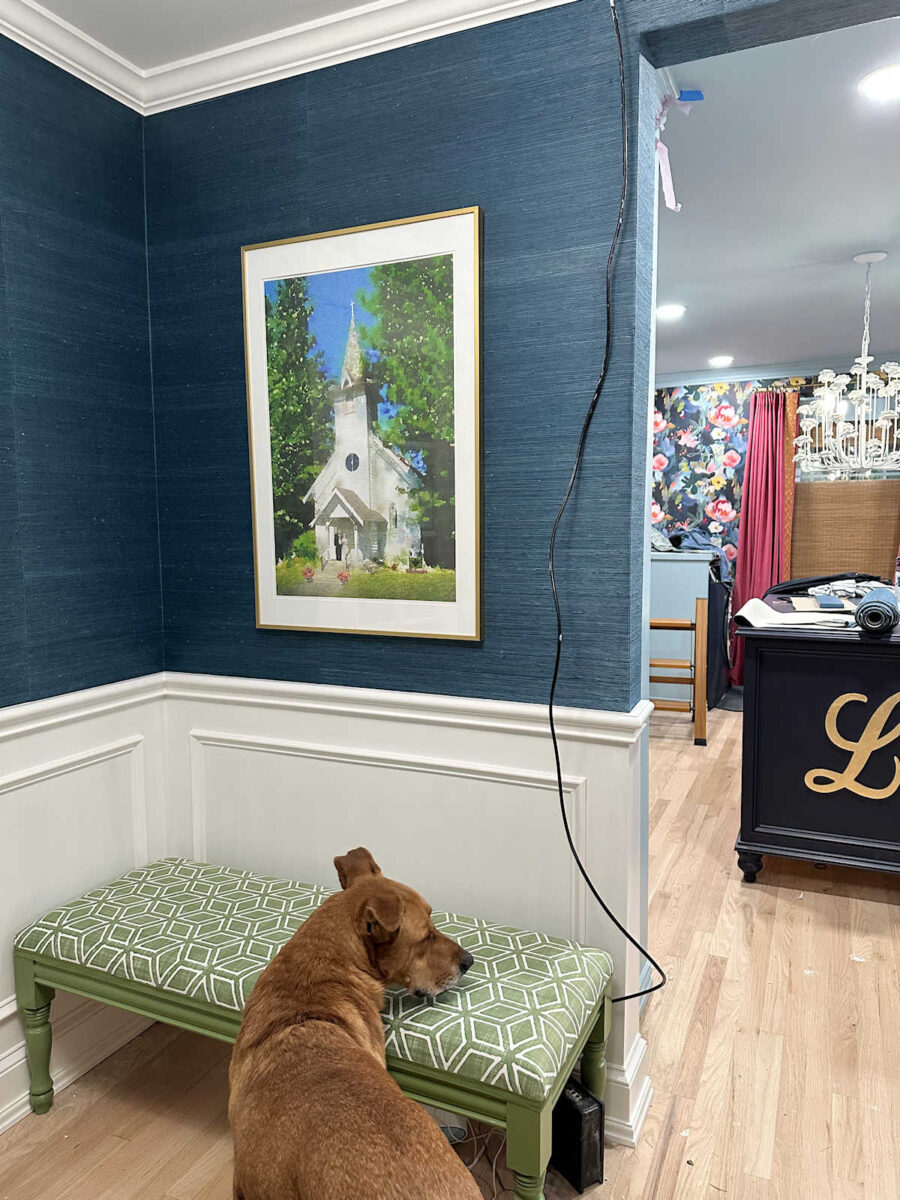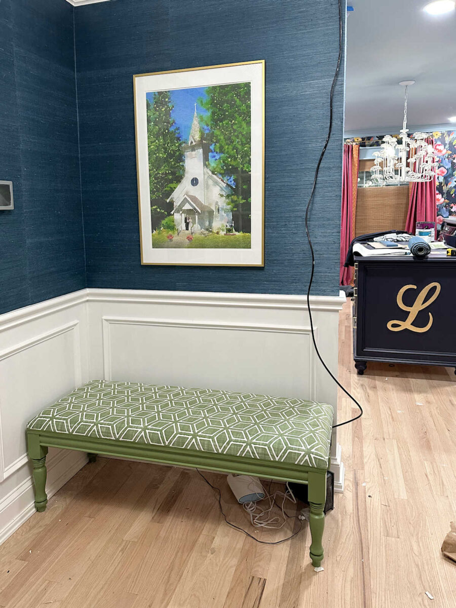 And here’s the bench in place in the foyer, along with the watercolor chapel picture that I finally hung on the wall. I know I still need to get that cable relocated. It’s pretty distracting, and I’ll get to it soon enough. So you’ll have to look past it for now.