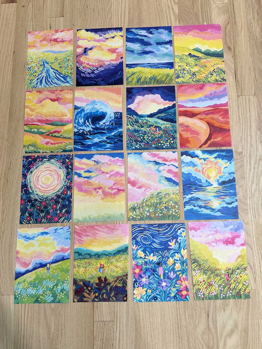 I can’t remember the name of the artist, but there are 52 colorful pictures in the book that look similar to this, and you can see why they appealed to me. The colors are just right for me…
