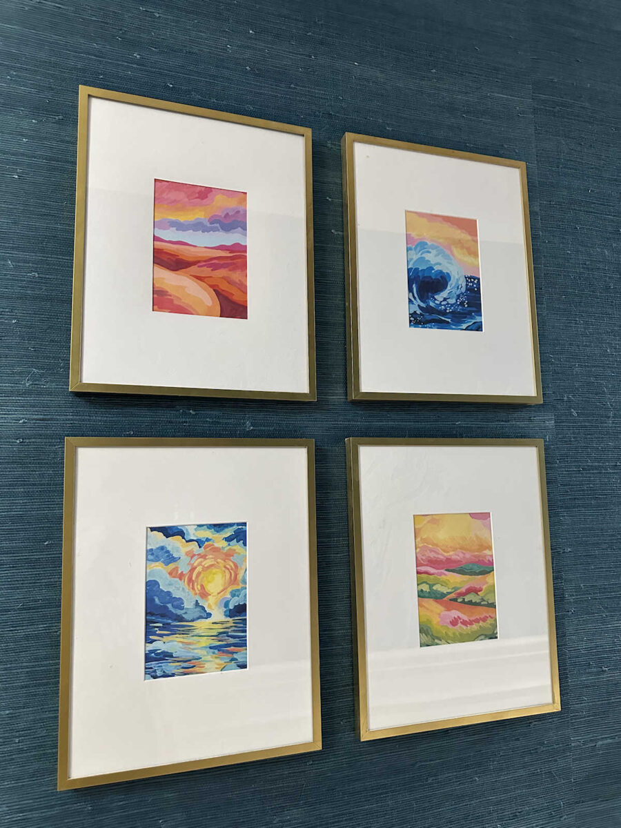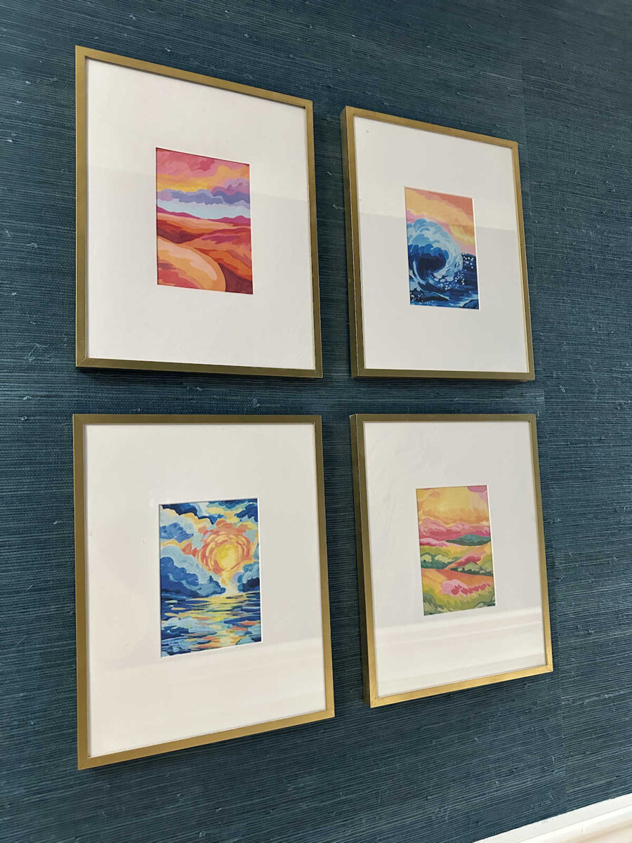 So these are only four of the sixteen that I selected from that book. I have twelve more that I can use somewhere, and the twelve that remain would make a beautiful gallery wall if I can find a place for them. But I think these four are perfect for this wall since they all have orange in them. They help to bridge the pinks in the closet and foyer with the oranges that will play so prominently in the bedroom.