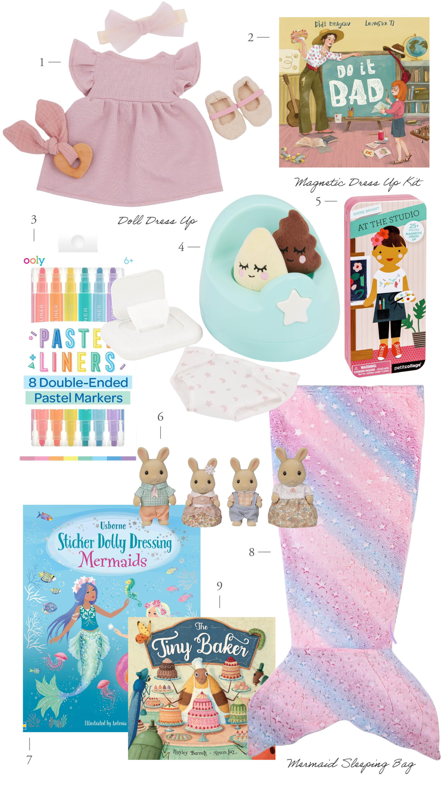 - Doll Dress Up Dress | 2. Do It Bad Book | 3. Pastel Double Ended Markers | 4. Doll Potty Training Accessories | 5. Magnetic Dress Up Play Set | 6. Calico Critters Rabbit Family | 7. Sticker Dolly Dressing Sticker Book | 8. Mermaid Tail Sleeping Bag | 9. The Tiny Baker Book