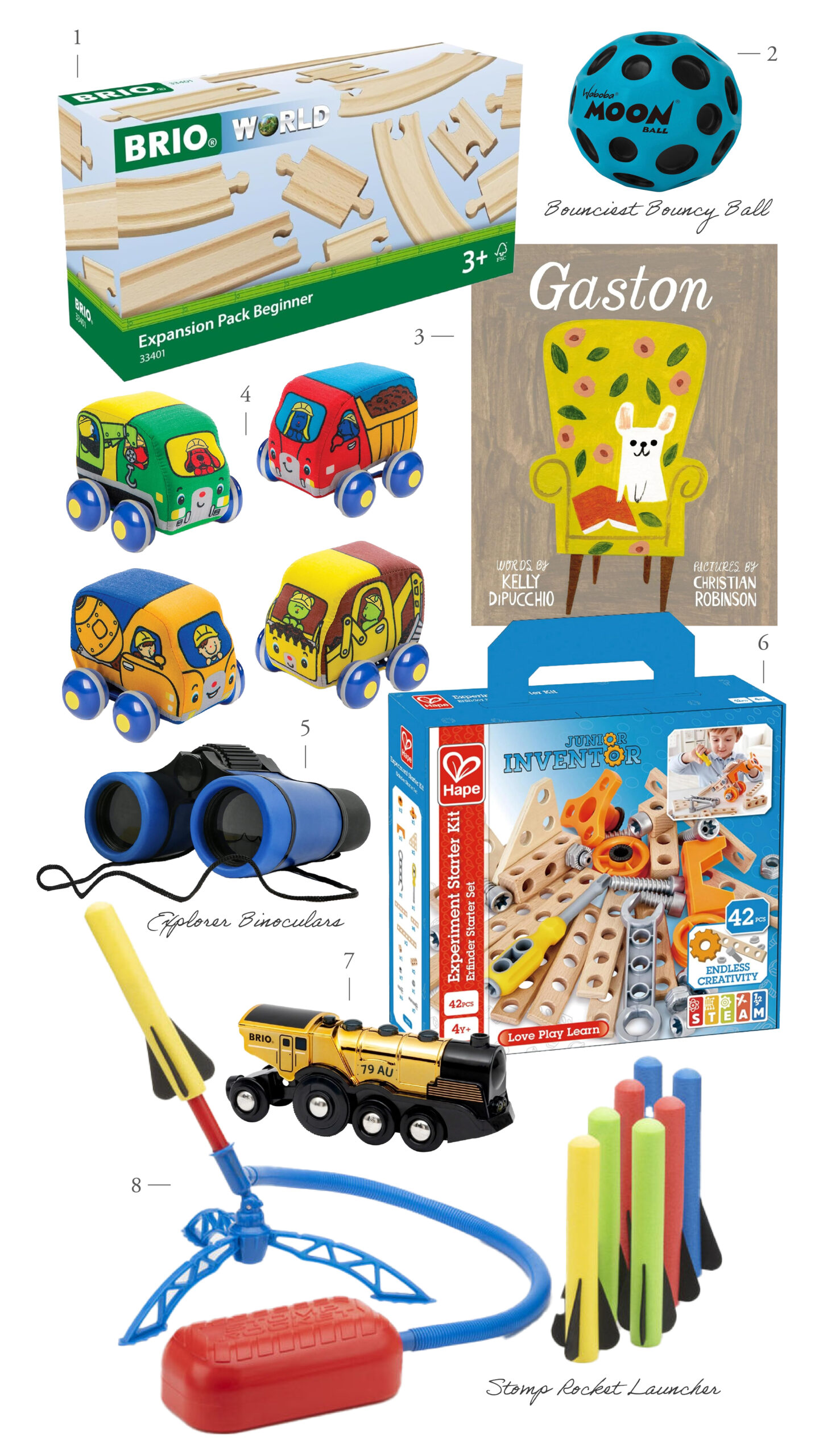 - Brio Expansion Pack | 2. Moon Ball | 3. Gaston Book | 4. Pull-Back Construction Cars | 5. Binoculars | 6. Inventor Kit | 7. Locomotive Battery Train | 8. Stomp Rocket Launcher