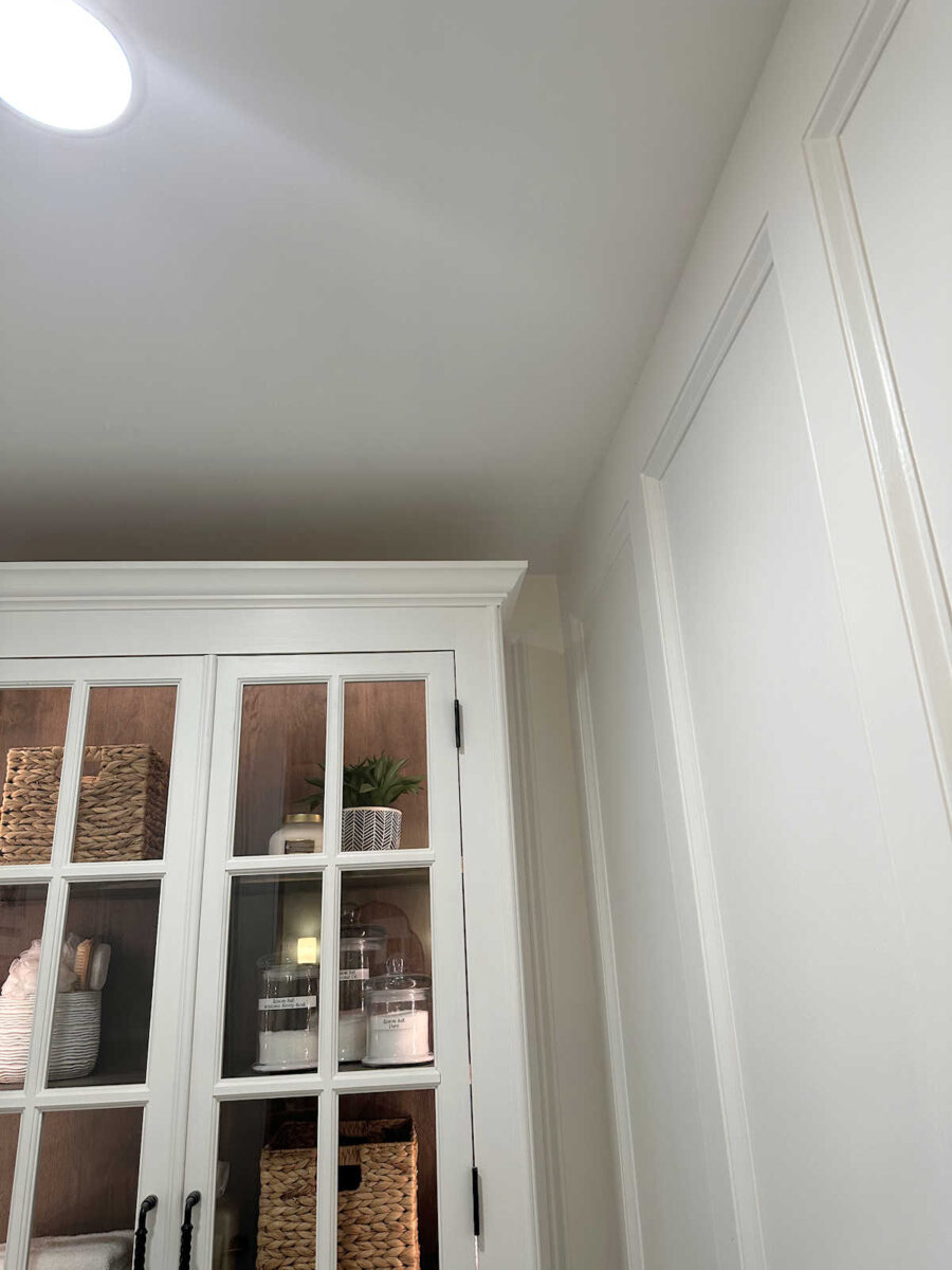 The crazy thing is that just on the other side of the wall, neither the wall nor the ceiling has any water damage at all. Not a single drop. This corner of the water closet in our bathroom is the same wall, same corner, just on the other side of the wall. Obviously, the trim might be hiding any water that got through on this side, but there’s not even any sign of water damage on the ceiling. That surprised me.