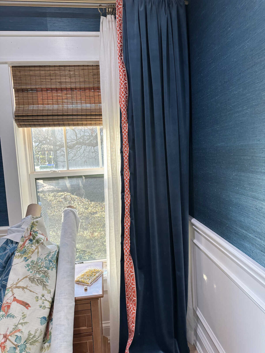 And a lot of people had some input on the drapery trim as well, so I wanted to live with that for a few days before I made my decision. I decided that I didn’t like it wrapped around the edge, but I do like the skinnier version of the trim. So I’m going to fold it, iron it, and inset it on the drapery panel about an inch.