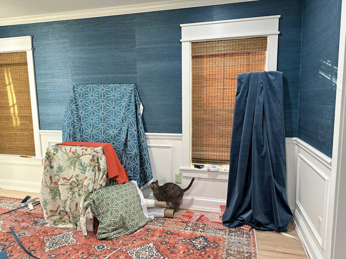 Here’s a glimpse of all the fabrics that I have. So you tell me. If this were your room, which fabric would you use on the headboard? But then, if you choose the bird fabric, you’ll have to tell me how you’d finish out the bed because that bird fabric will not work as a bedskirt.